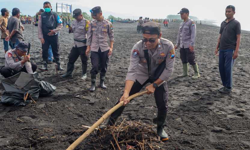 Ratusan personel Polres Lumajang Polda Jatim menyisir bibir pantai membersihkan sampah plastik maupun limbah organik yang terbawa arus laut.