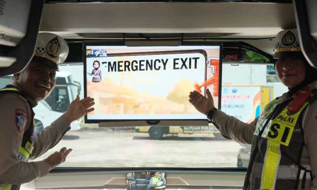 Salah satunya melalui program “Polantas Menyapa” dengan penayangan video keselamatan di bus angkutan penumpang.