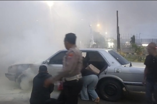 Polres Ngawi Sigap Bantu Padamkan Mobil Terbakar di Rest Area Km 575B