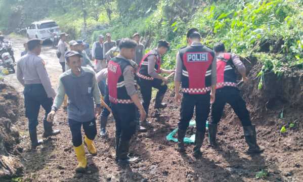 Sejumlah persomel Polres Probolinggo Polda Jatim bersama masyarakat bahu-membahu membersihkan material banjir berupa lumpur, tanah, dan bebatuan.