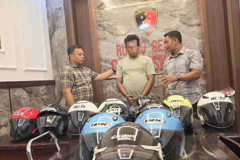 Pelaku berhasil diamankan berikut 12 buah helm sebagai barang bukti hasil kejahatan.