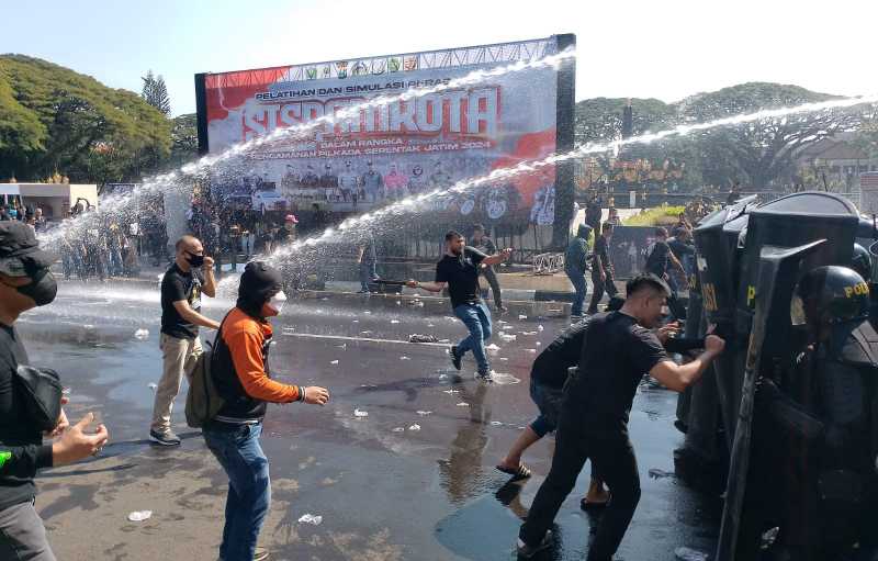 Tampak pada adegan simulasi, massa yang tidak puas berhasil dipukul mundur oleh Pasukan Pengendali Massa (Dalmas) Polresta Malang Kota.