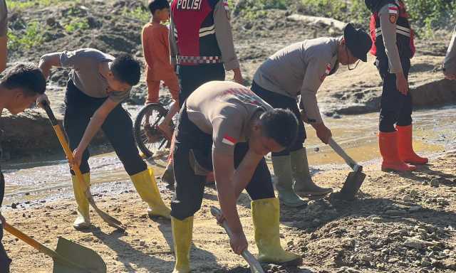 Polri Bersihkan Area Terdampak Banjir Bandang di Kampung Tengah Kecamatan Palembayan Agam Sumbar
