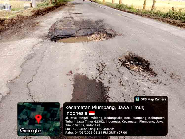 TUBAN | DN – Kondisi poros jalan raya Rengel–Widang tepatnya di Kedungsoko, Kecamatan Plumpang, Kabupaten Tuban, semakin memprihatinkan. Kerusakan berupa lubang cukup dalam di sepanjang jalur tersebut membuat pengendara, khususnya sepeda motor, harus ekstra hati-hati agar tidak celaka.