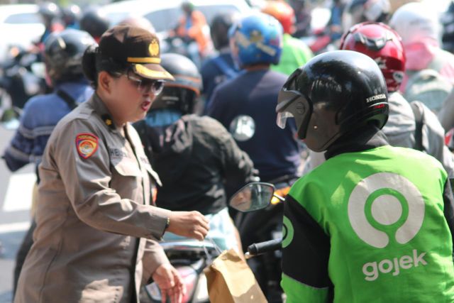 Sesekali para Polwan Polrestabes Surabaya ini tampak menyapa warga yang melintas dan memberikan seikat bunga kepada pengguna jalan.
