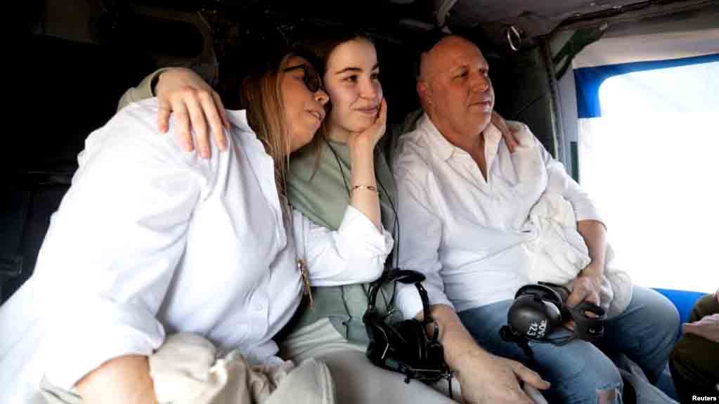 Sandera Israel yang dibebaskan, Agam Berger, seorang tentara yang ditangkap dari pangkalan militernya di Israel selatan, diangkut dengan helikopter bersama orang tuanya ke rumah sakit setelah pembebasannya, Kamis 30 Januari 2025.
