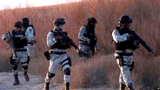 DN – Para anggota Garda Nasional yang mengenakan masker dan bersenjata berjalan melewati semak-semak di sepanjang barikade perbatasan di pinggiran kota Ciudad Juárez. Mereka mengeluarkan tangga darurat dan tali temali yang diselipkan di parit, dan membawanya ke truk. Patroli juga terlihat di beberapa daerah lain perbatasan di dekat Tijuana.