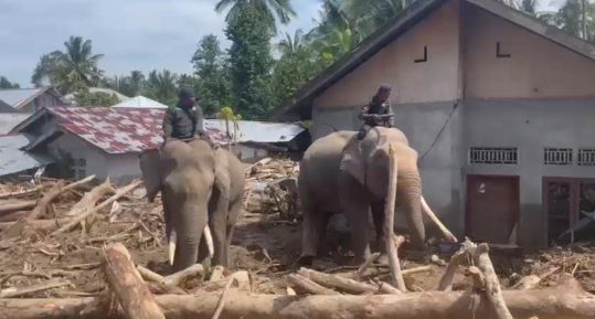 MEURUDEU | DN – Empat ekor gajah milik Balai Konservasi Sumber Daya Alam (BKSDA) Aceh telah tiba lengkap di Kabupaten Pidie Jaya untuk membantu proses pembersihan material pascabencana banjir. Hewan-hewan tersebut langsung dikerahkan untuk menarik timbunan kayu dan material berat yang terseret arus banjir beberapa waktu lalu.