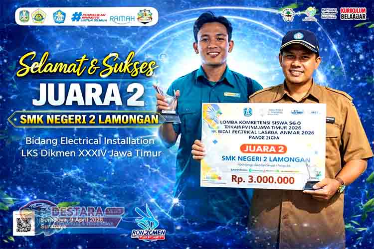 SURABAYA | DN – Dunia pendidikan vokasi kembali mencatat prestasi membanggakan. Siswa SMK Negeri 2 Lamongan berhasil meraih Juara 2 dalam ajang Lomba Kompetensi Siswa (LKS) Dikmen XXXIV Tingkat Provinsi Jawa Timur Tahun 2026, pada bidang Electrical Installation (Instalasi Listrik).