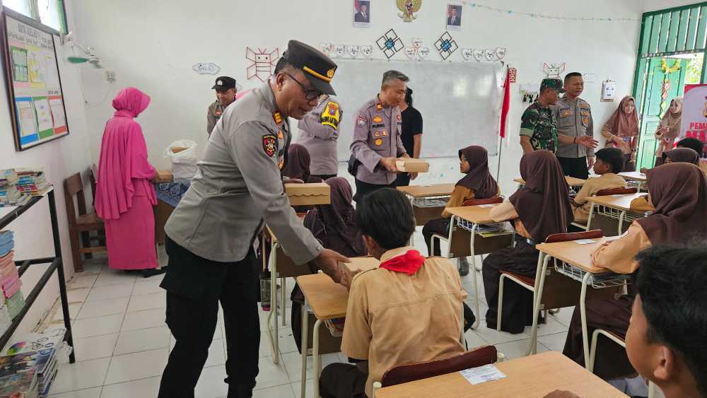 Terlihat raut keceriaan seluruh siswa-siswi menyambut kedatangan anggota kepolisian, pelajar dari kelas 1 hingga 6 berjumlah 90 siswa mendapat bagian makanan bergizi.