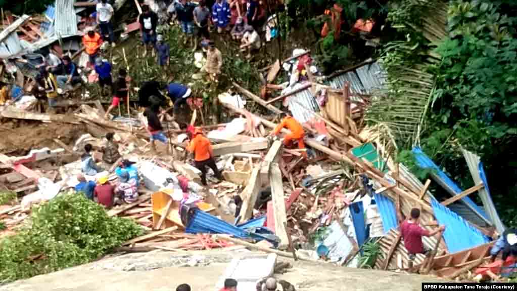Sedikitnya 14 orang tewas akibat tanah longsor di Kabupaten Tana Toraja, Sulawesi Selatan, Sabtu (13/4). (Foto: Courtesy/BPBD Kab. Tana Toraja)