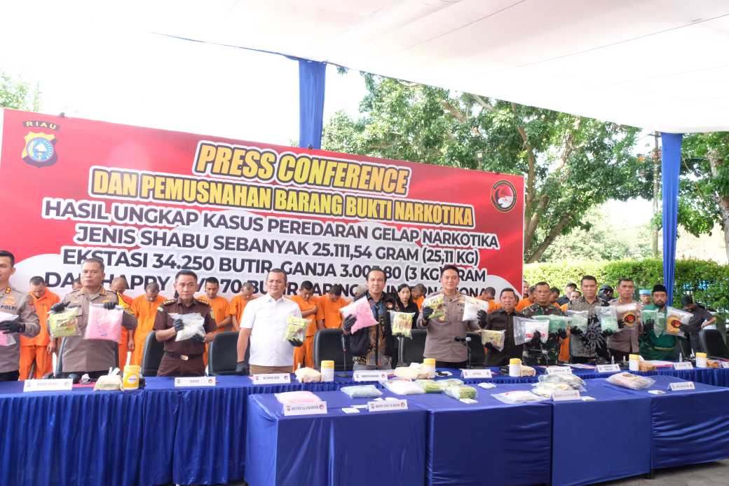 RIAU |DN – Dit Narkoba Polda Riau berhasil menggagalkan peredaran gelap narkoba jenis sabu sebanyak 25 Kg dan 34.000 pil ekstasi selama dua bulan terakhir. Seluruh barang haram itu pun dimusnahkan pada 12 Juli 2024.