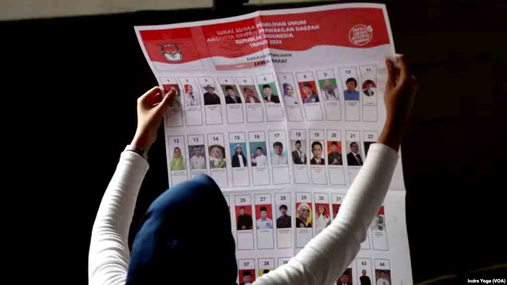 Seorang petugas memeriksa lembar surat suara untuk pemilihan Dewan Perwakilan Daerah RI (DPD RI) di Gudang KPU Kota Depok, di Cibinong, Jawa Barat, Rabu, 10 Januari 2024 (Foto: Indra Yoga/VOA)