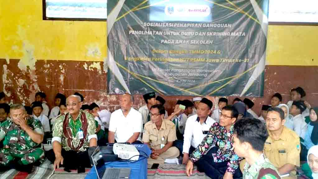 JOMBANG | DN – Dalam rangkaian kegiatan TNI Manunggal Membangun Desa (TMMD) ke-120, Kodim 0814/Jombang bekerja sama dengan Rumah Sakit Cipto Mangunkusumo (RSCMM) Surabaya menyelenggarakan screening mata gratis di Sekolah MI Faster, Desa Panglungan, Kecamatan Wonosalam. Acara tersebut dihadiri oleh Dr. Eka Basuki Rachmat dari RSCMM Surabaya.( Selasa tanggal 4 Juni 2024)